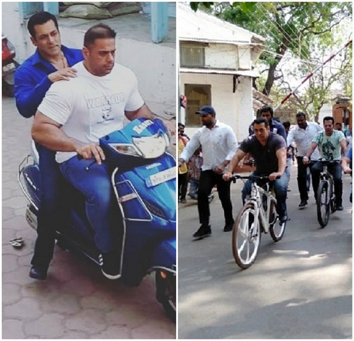 ਤਸਵੀਰਾਂ 'ਚ ਸਲਮਾਨ ਖਾਨ ਇਕ ਸ਼ਖਸ ਪਿੱਛੇ ਐਕਟਿਵਾ 'ਤੇ ਬੈਠੇ ਨਜ਼ਰ ਆ ਰਹੇ ਹਨ। ਸਲਮਾਨ ਖਾਨ ਬਲੂ ਸ਼ਰਟ ਅਤੇ ਬਲੈਕ ਪੈਂਟ 'ਚ ਕਾਫੀ ਹੈਂਡਸਮ ਦਿਖਾਈ ਦੇ ਰਹੇ ਸਨ। ਉੱਥੇ ਹੀ ਇਕ ਵੀਡੀਓ 'ਚ ਉਹ ਸਾਈਕਲ ਚਲਾਉਂਦੇ ਵੀ ਦਿਖਾਈ ਦੇ ਰਹੇ ਹਨ।